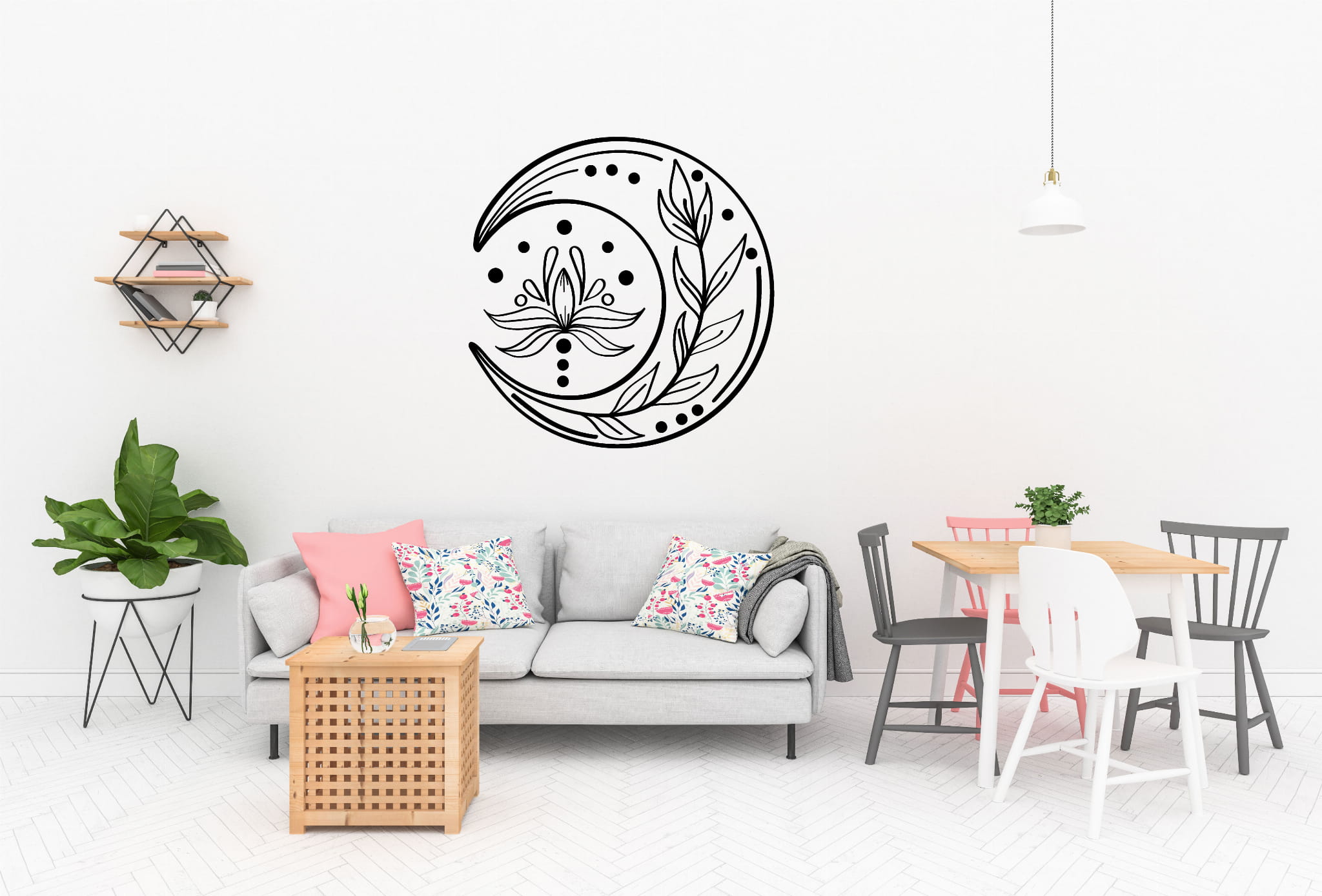 Dodaj do swojego wnętrza mistyczną i harmonijną energię dzięki wyjątkowej naklejce ściennej z symbolem Księżyca, kwiatem i liśćmi. Ten elegancki i minimalistyczny wzór doskonale sprawdzi się jako dekoracja ścienna w stylu ezoterycznym, boho, zen i skandynawskim. Symbolika Księżyca nawiązuje do intuicji, wewnętrznej równowagi i cyklicznej transformacji, a motyw roślinności podkreśla połączenie z naturą i spokojem.