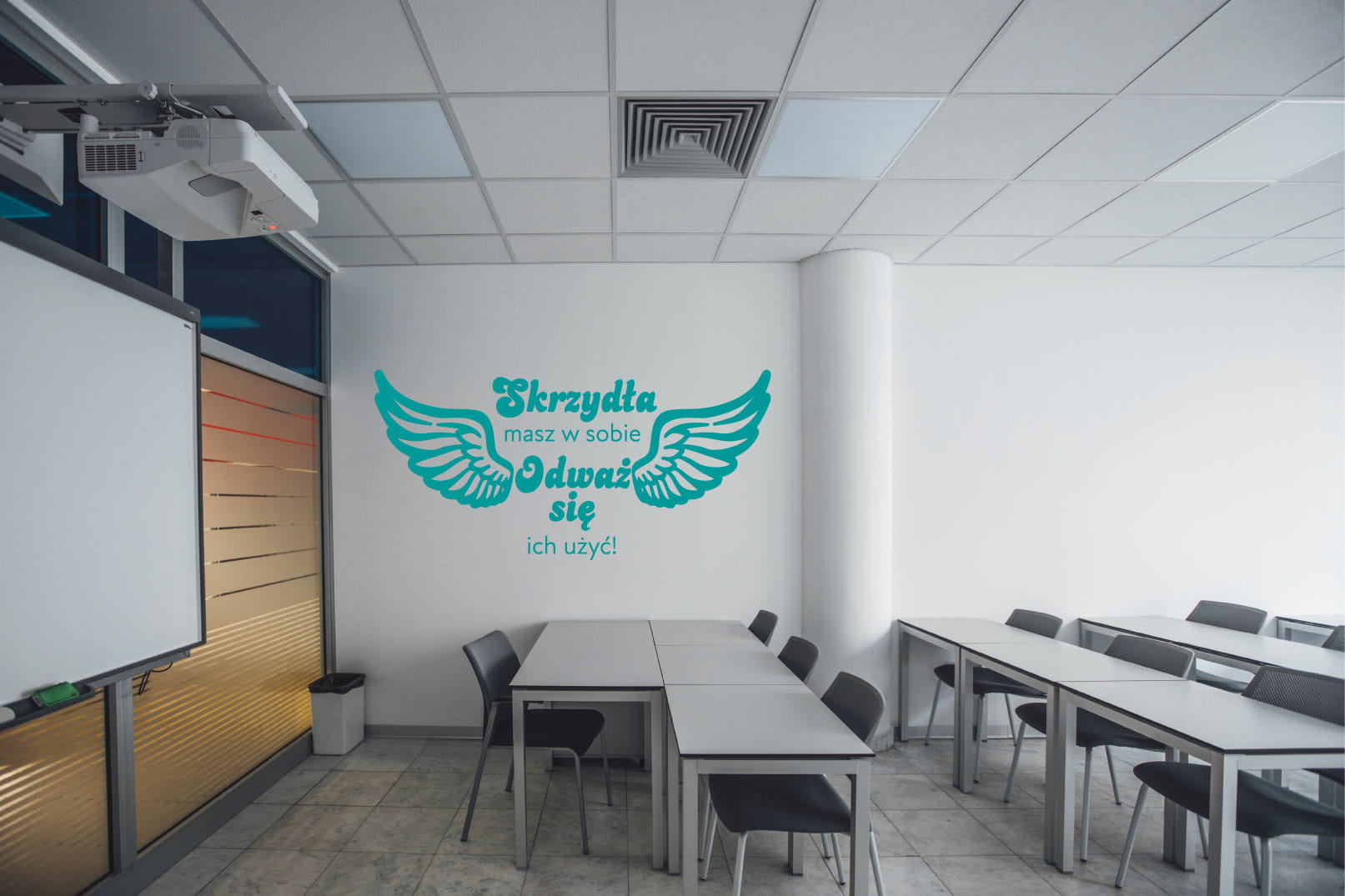 Motywująca naklejka ścienna z napisem „Skrzydła masz w sobie — odważ się ich użyć!” to inspirująca dekoracja idealna do sal lekcyjnych, szkół, pracowni, świetlic oraz miejsc, w których ważne jest budowanie pewności siebie i motywowanie uczniów. Motyw skrzydeł symbolizuje możliwości, rozwój i odwagę w sięganiu po więcej, a dynamiczny układ tekstu skutecznie przyciąga wzrok.