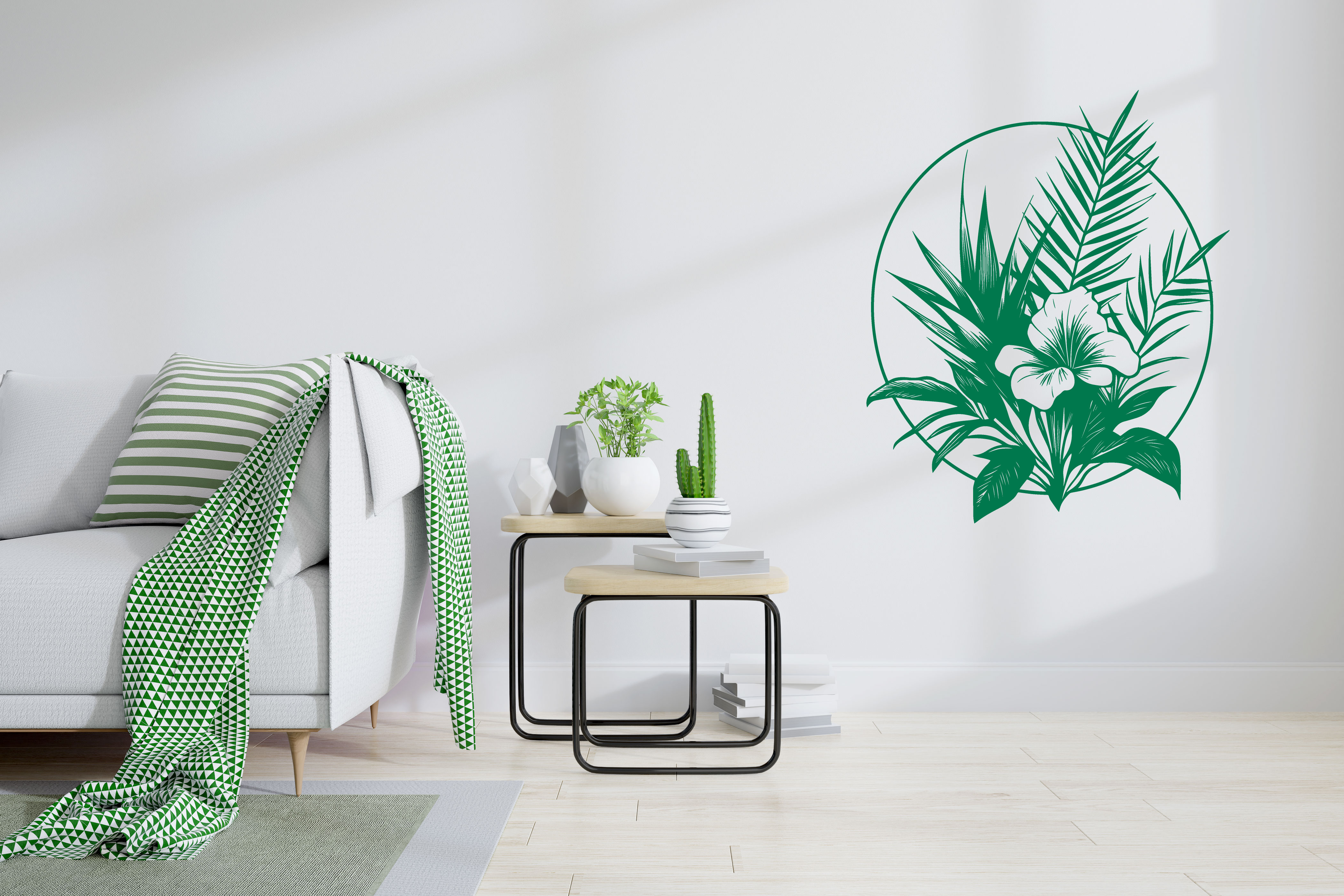 Szukasz dekoracji, która połączy miłość do natury z nowoczesnym, uporządkowanym designem? Nasza okrągła naklejka ścienna z motywem tropikalnym to propozycja, która przyciąga wzrok swoją symetrią i precyzją wykonania. Centralnym punktem kompozycji jest rozkwitający kwiat hibiskusa, otoczony gęstym splotem smukłych liści palmy. Całość wpisana w idealny okrąg tworzy spójny obraz, który świetnie zastępuje tradycyjne obrazy czy plakaty. Stylistyka line art sprawia, że wzór jest lekki i nowoczesny, dzięki czemu nie przytłacza pomieszczenia, lecz staje się jego wyrafinowanym dopełnieniem.