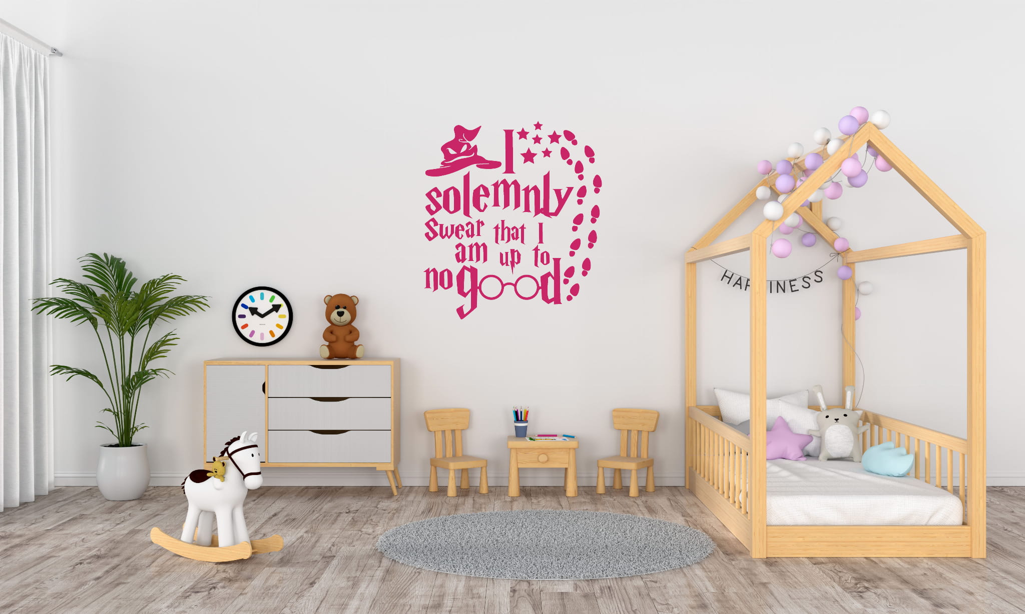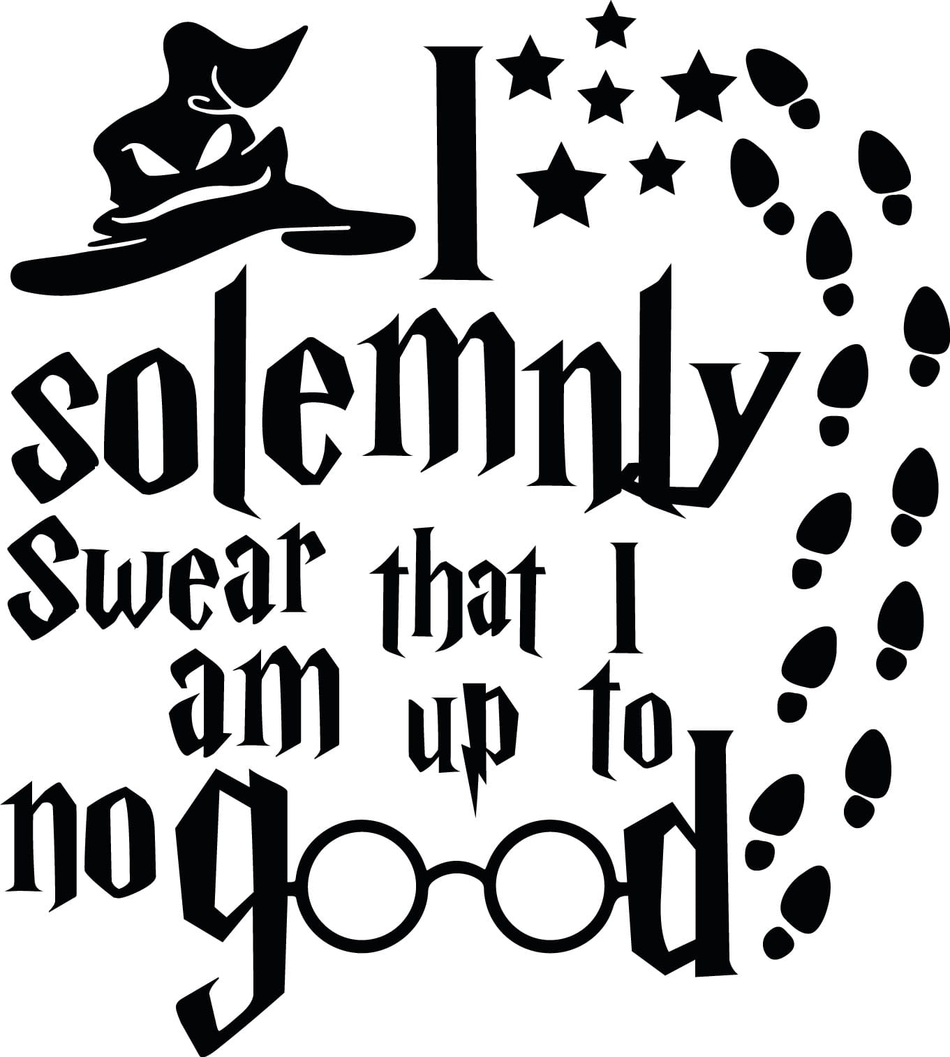 Naklejka ścienna "I Solemnly Swear" inspirowana serią o Harrym Potterze to idealny wybór dla fanów magii i przygód z Hogwartu. Wzór przedstawia słynny cytat z mapy Huncwotów: „I solemnly swear that I am up to no good” (Uroczyście przysięgam, że knuję coś niedobrego), zapisany charakterystyczną, gotycką czcionką. Całość uzupełniona jest o magiczne elementy, takie jak tiara przydziału, gwiazdy oraz ślady stóp, które wprowadzają dodatkową atmosferę tajemniczości.