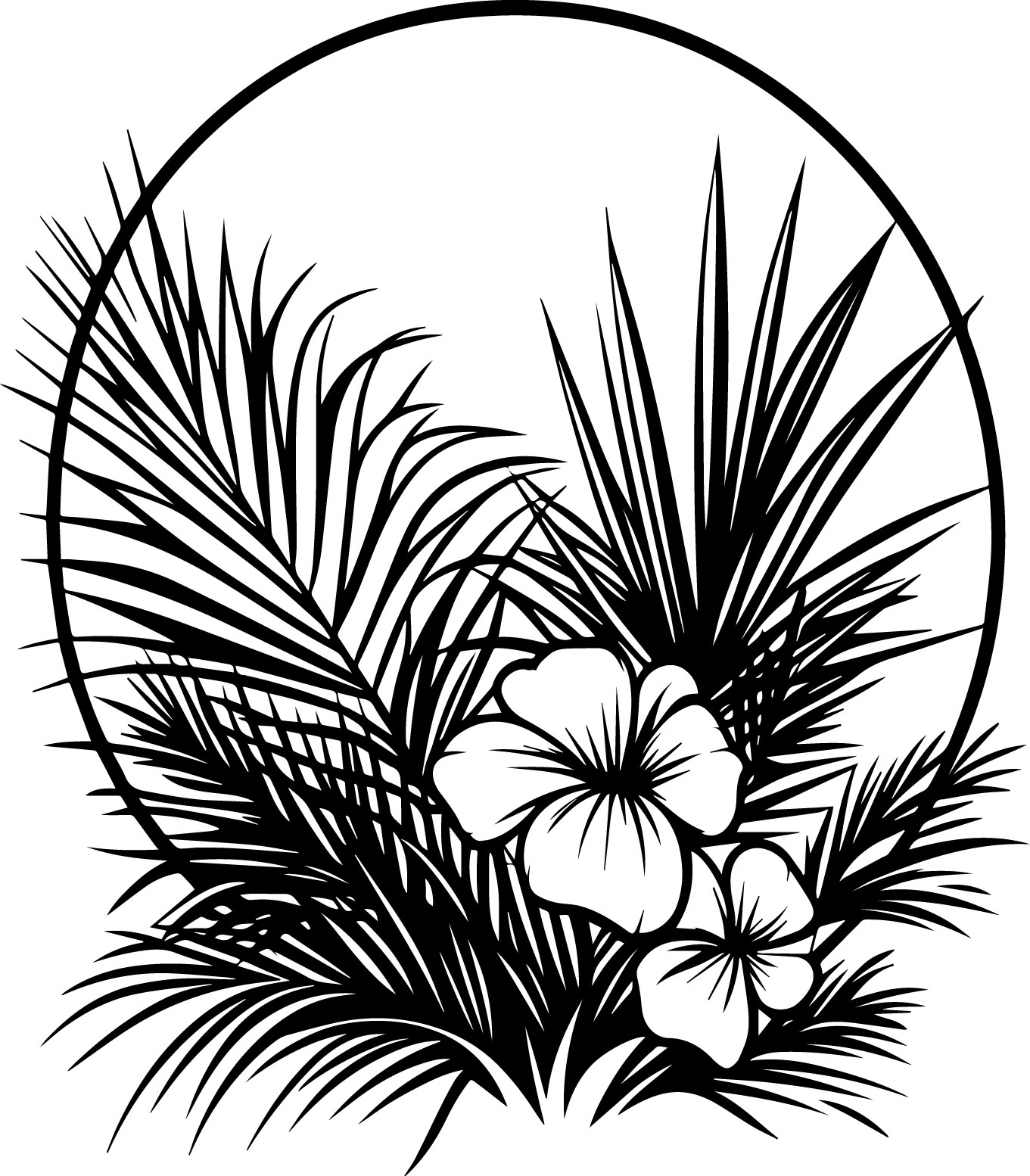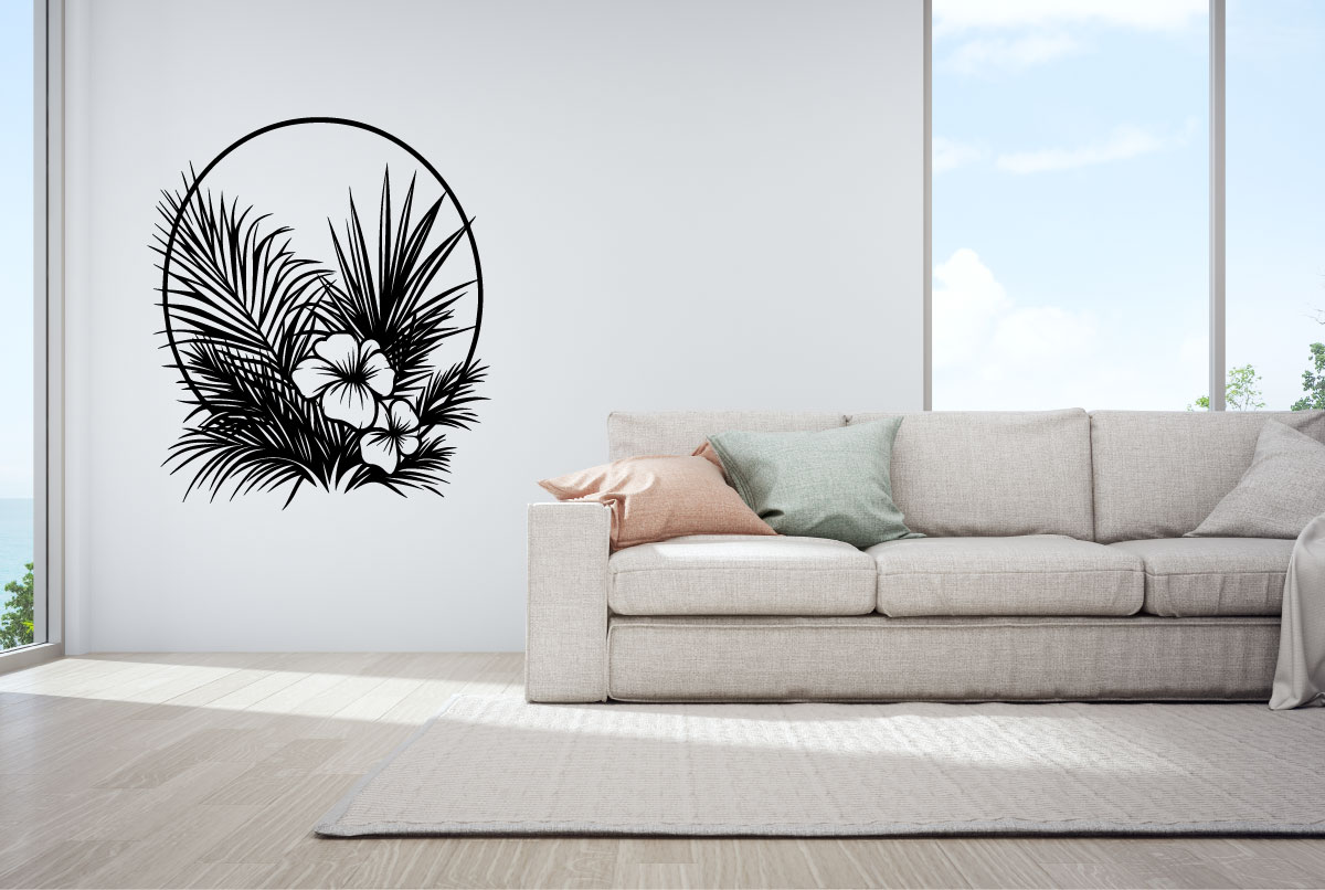 Szukasz dekoracji, która zdominuje przestrzeń i nada jej unikatowego, wakacyjnego charakteru? Nasza naklejka ścienna z motywem tropikalnym to rozbudowana kompozycja botaniczna zamknięta w eleganckim okręgu. Wzór łączy w sobie smukłe liście palmy, ostre linie egzotycznej flory oraz delikatne kielichy kwiatów hibiskusa. Dzięki formie koła, dekoracja ścienna wprowadza do wnętrza ład i harmonię, stając się idealnym tłem dla nowoczesnych mebli. Stylistyka line art sprawia, że mimo bogactwa detali, wzór pozostaje lekki i subtelny, idealnie integrując się z kolorem Twojej ściany i tworząc efekt profesjonalnego muralu.