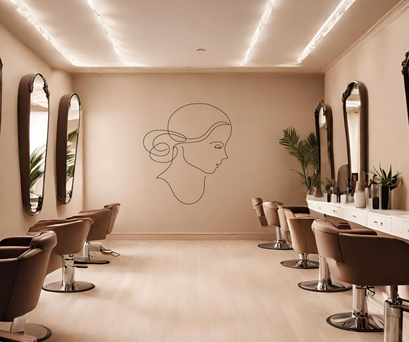 Naklejka ścienna z motywem kobiecej głowy o subtelnie związanych włosach w stylu linearnym to doskonały dodatek dekoracyjny do salonu fryzjerskiego lub kosmetycznego. Wykonana z cienkiej, eleganckiej linii, przedstawia profil kobiety o delikatnych rysach i płynnych, artystycznie zarysowanych włosach. Styl minimalistyczny naklejki ściennej wprowadza do wnętrza nowoczesny, a jednocześnie subtelny akcent, podkreślając profesjonalny charakter miejsca. Idealnie nadaje się do udekorowania ściany nad lustrem, przy recepcji lub w przestrzeni wypoczynkowej dla klientów. Naklejka ścienna do salonu fryzjerskiego dostępna jest w różnych rozmiarach, co pozwala dopasować ją do każdej przestrzeni. Wysokiej jakości materiał gwarantuje trwałość oraz łatwość aplikacji.