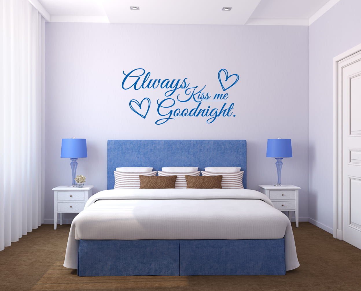 Szukasz oryginalnej ozdoby ściennej do swojej sypialni? Naklejka ścienna po angielsku z napisem "Always kiss me goodnight" ożywi każde nudne wnętrze i nada mu wspaniałego charakteru. Napis na ścianę dostępny jest w różnych rozmiarach i kolorach, dzięki czemu możesz go dopasować do każdego wnętrza.