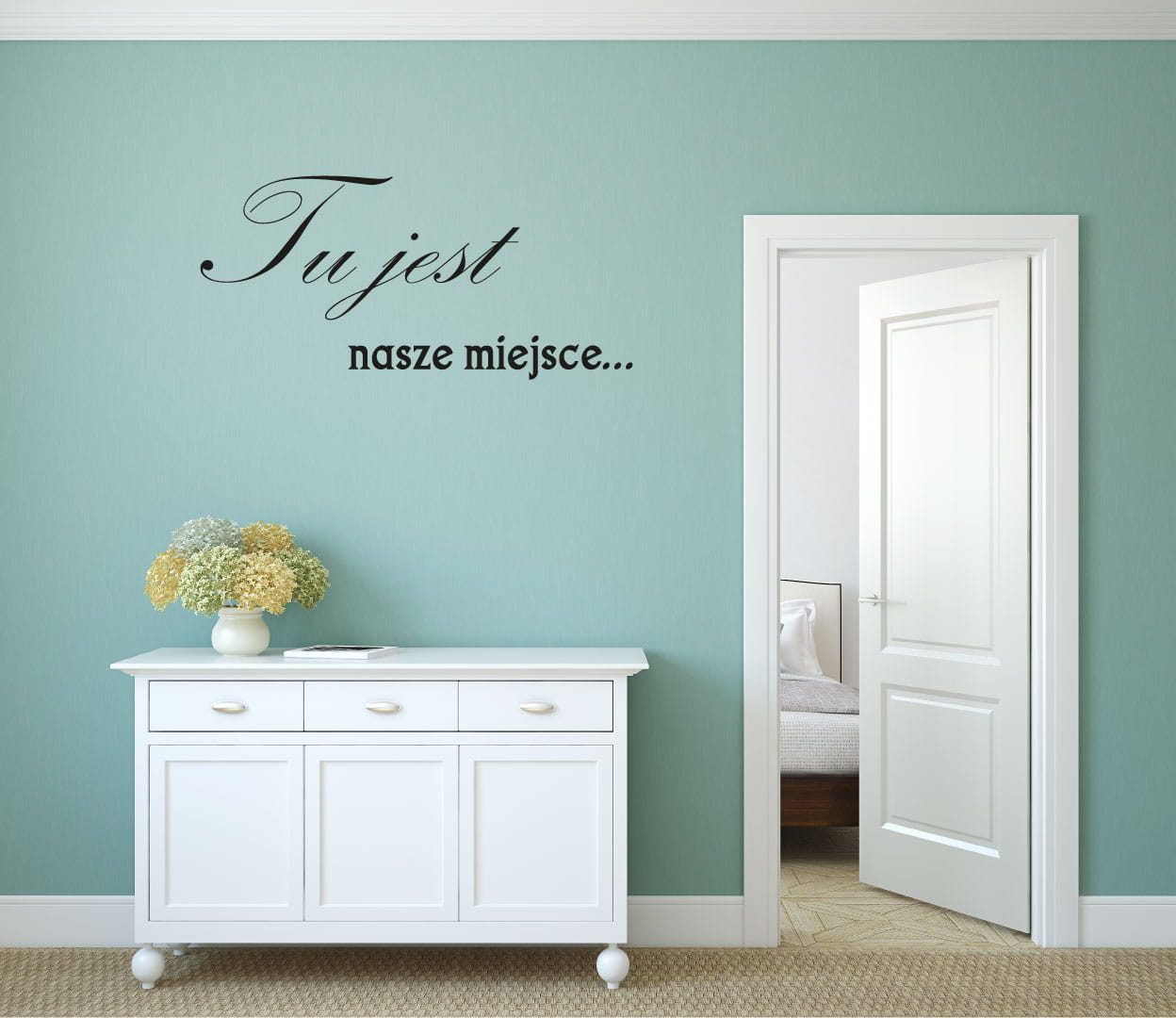 Szukasz naklejki na ścianę z napisem ? Chcesz ozdobić swoje wnętrze niebanalnym akcentem? Napis na ścianę do przedpokoju z cytatem " Tu jest nasze miejsce..." doskonale wypełni Twoje puste ściany. Napisy ścienne zawsze są super pomysłem. Idealnie komponują się w salonie, przedpokoju czy sypialni. Napisy na ścianę wspaniale prezentują się nad łóżkiem, biurkiem lub między oknami, ogranicza Cię tylko Twoja wyobraźnia.