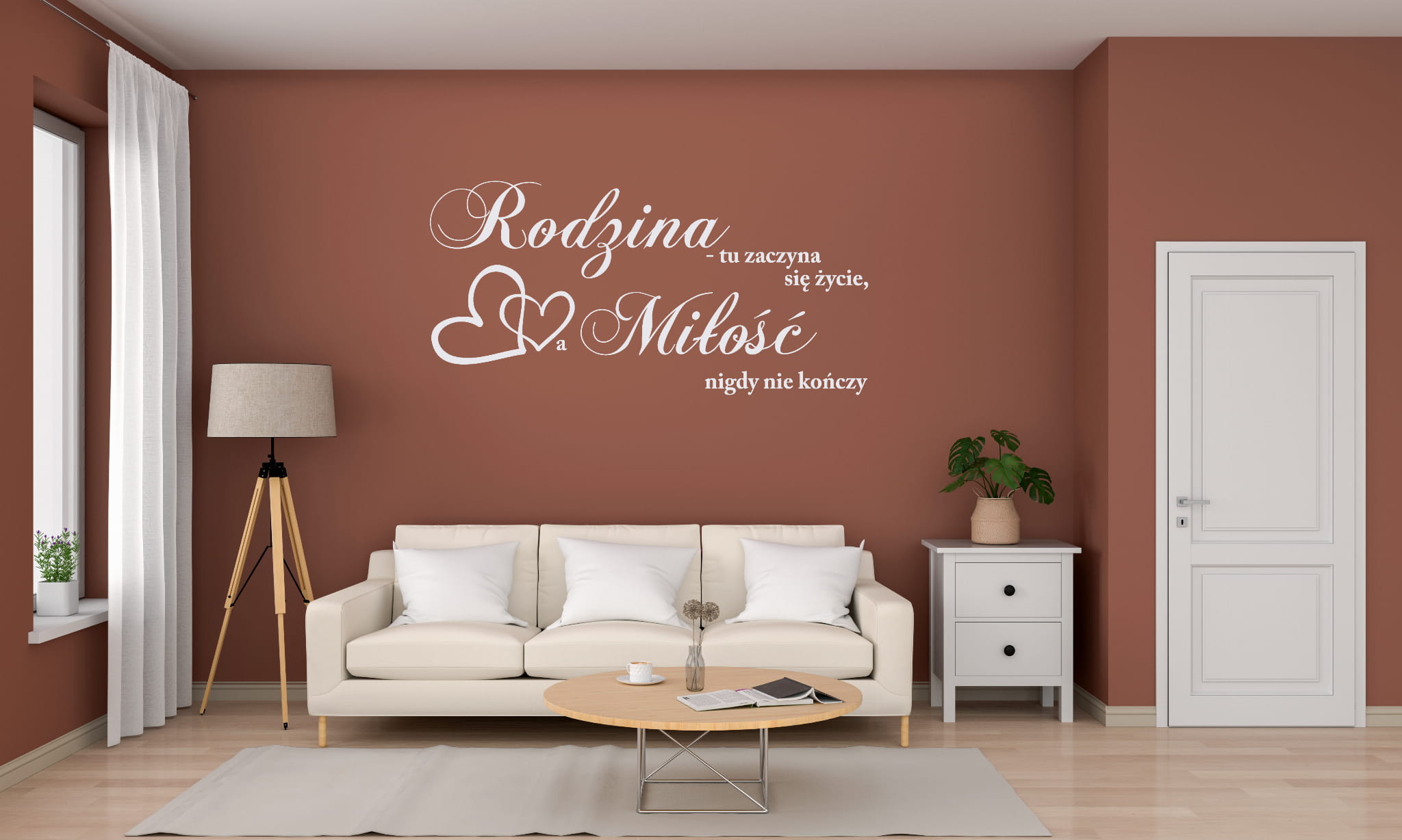 Naklejka ścienna "Rodzina Tu Zaczyna Się Życie, a Miłość Nigdy Nie Kończy" to dekoracja, która wniesie do Twojego domu ciepło i poczucie bliskości. To przypomnienie o tym, że to miejsce jest pełne miłości i gotowe na nowe, wspólne życie.